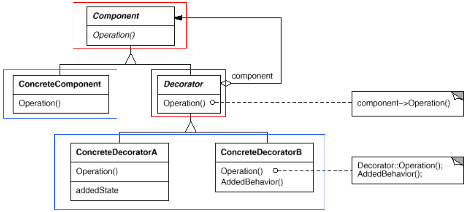 Decorator 类在接口上表现为 is-a Component 的继承关系,记Decorator类继承了 Component 类所具有的接口。但在实现上又表现为 has-a Component 的组合关系,即 Decorator 类又失恋了另一个 Component 类。